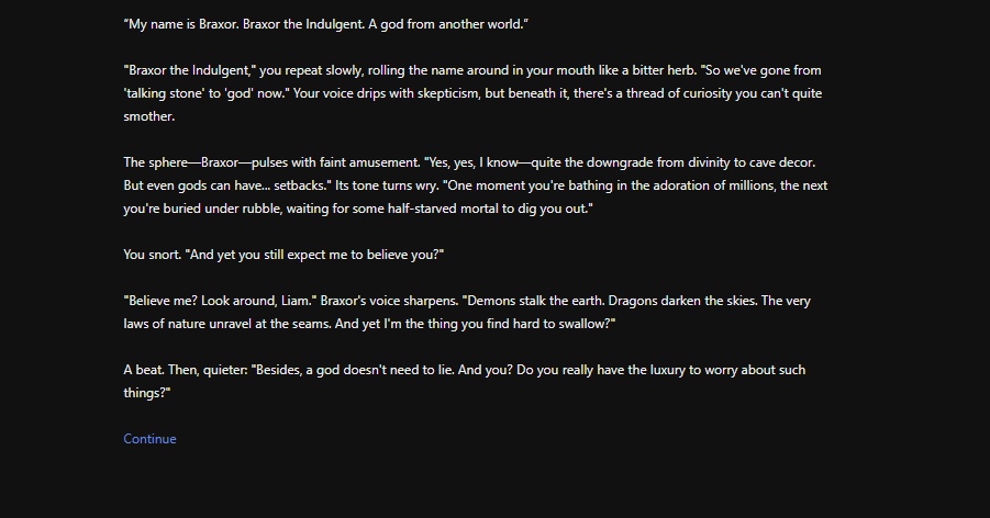 Glorious Ascension is a text-based fantasy NSFW RPG set in a crumbling world where the only path to salvation is to rise above it toward godhood. Explore a dying land, uncover lost powers, and shape your fate as you pursue divine ascension.