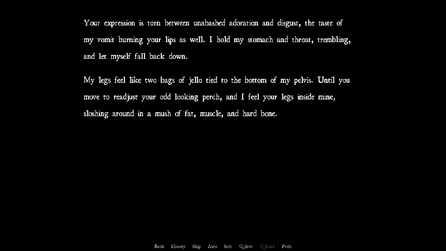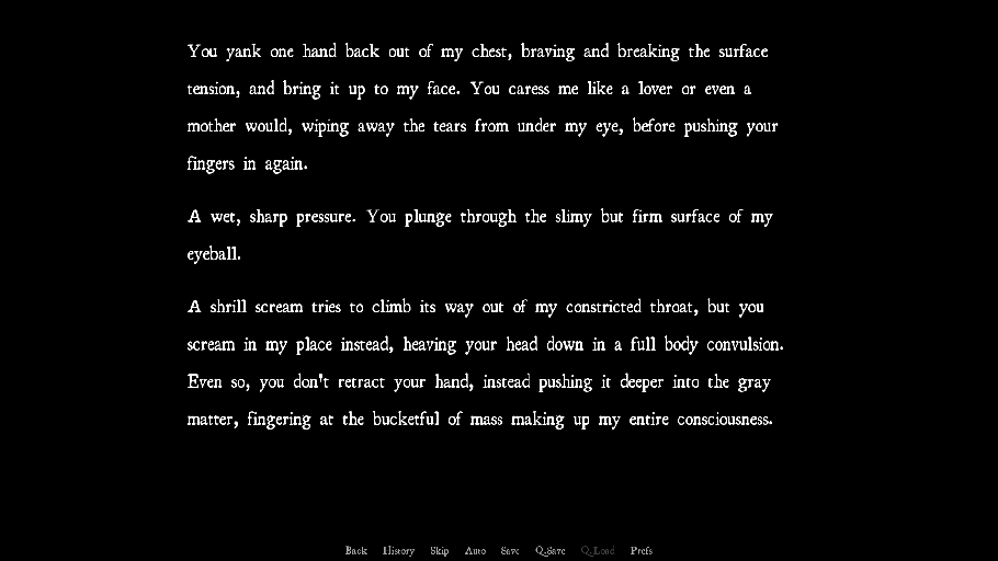 A little tale of your clone killing you after fucking you. Just text and sound, no pictures. EroHorror VN Jam 2025 submission.