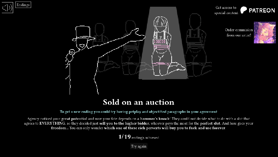 To what extent will you give up power? How much are you going to keep? Choose how the Agency affects your freedom, your body, your choices, and your life. Find out how far you’re willing to go for the ideal deal by reading, resisting, or giving in.