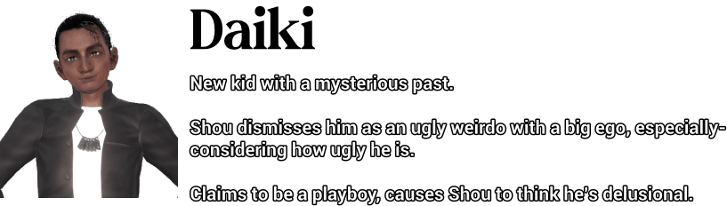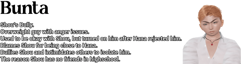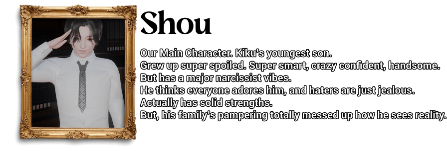 For Shou, life isn’t just easy — it’s untouchable. Every success is met with thunderous approval. Every mistake is brushed aside with excuses or sympathy. Years of unrelenting adoration have forged his ego into something unshakable — a self-assurance that borders on arrogance. And why wouldn’t it? He’s intelligent, charming, and impossibly attractive. In his mind, love and forgiveness are givens — rewards of simply being who he is. Even the bullies at school can’t shake him; he writes them off as envious nobodies, barely worth noticing.